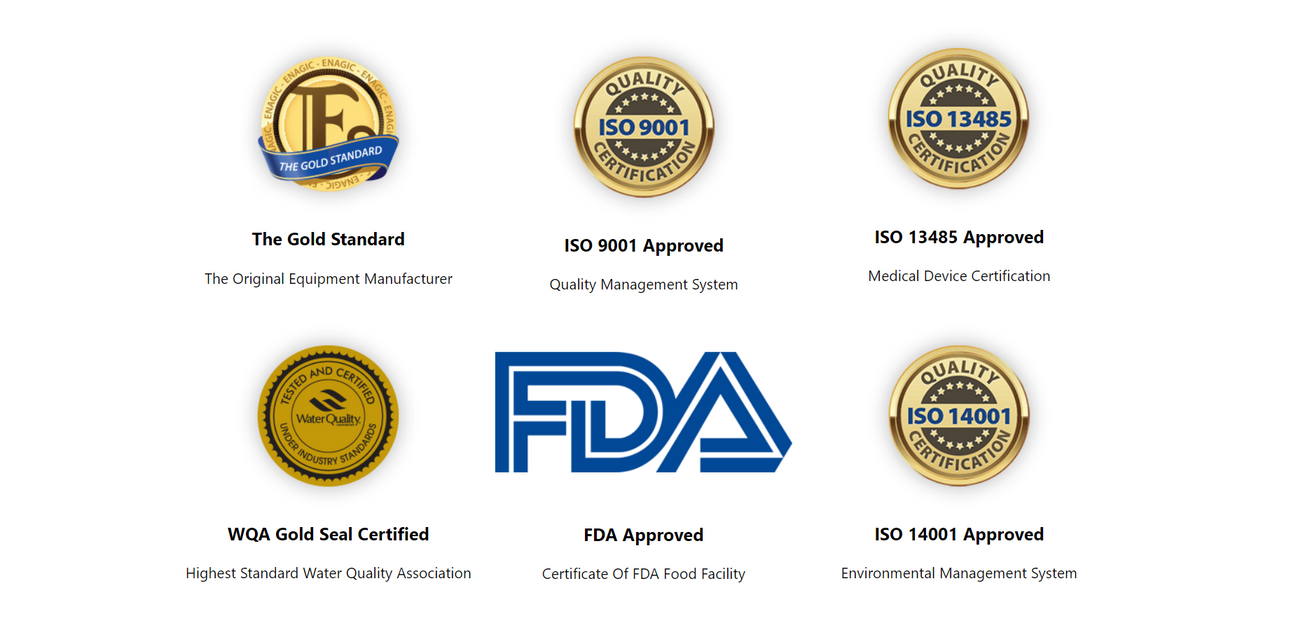 Enagic International is certified to ISO 9001, ISO 14001, and ISO 13485 for quality control and environmental management, the Water Quality Association Gold Seal for product certification, and a member in good standing of the prestigious Direct Selling Association.